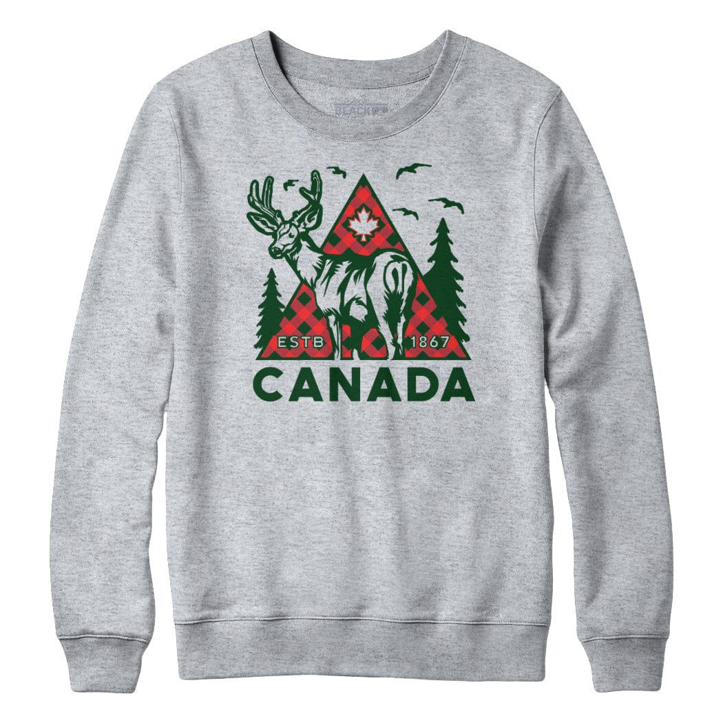 Celebrate Canada’s rugged beauty with these stylish adult sweatshirts featuring a majestic deer standing before a buffalo plaid mountain, surrounded by a serene forest. Complete with 'Canada' and the nation’s established date, this design is a perfect blend of nature and heritage.