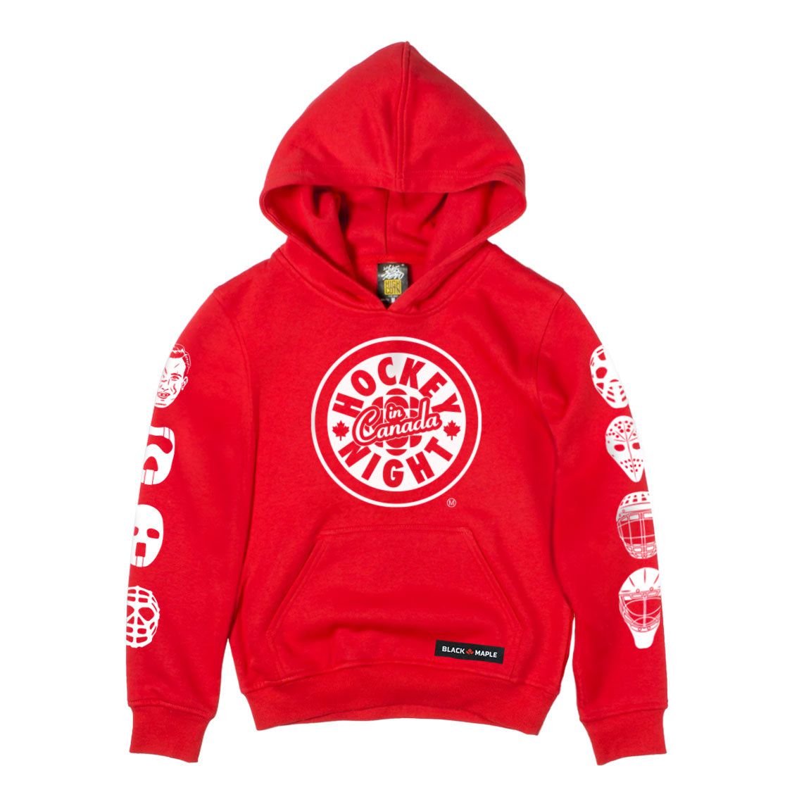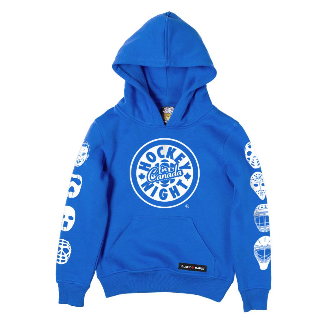 Celebrate hockey history with our Hockey Night in Canada Goalie Mask Evolution Kids Sweatshirt and Hoodie! Showcasing a cool sleeve design of goalie mask evolution alongside the iconic HNIC logo, this cozy hoodie is perfect for young fans. Warm, comfortable, and packed with style, it’s a must-have for any budding hockey enthusiast!