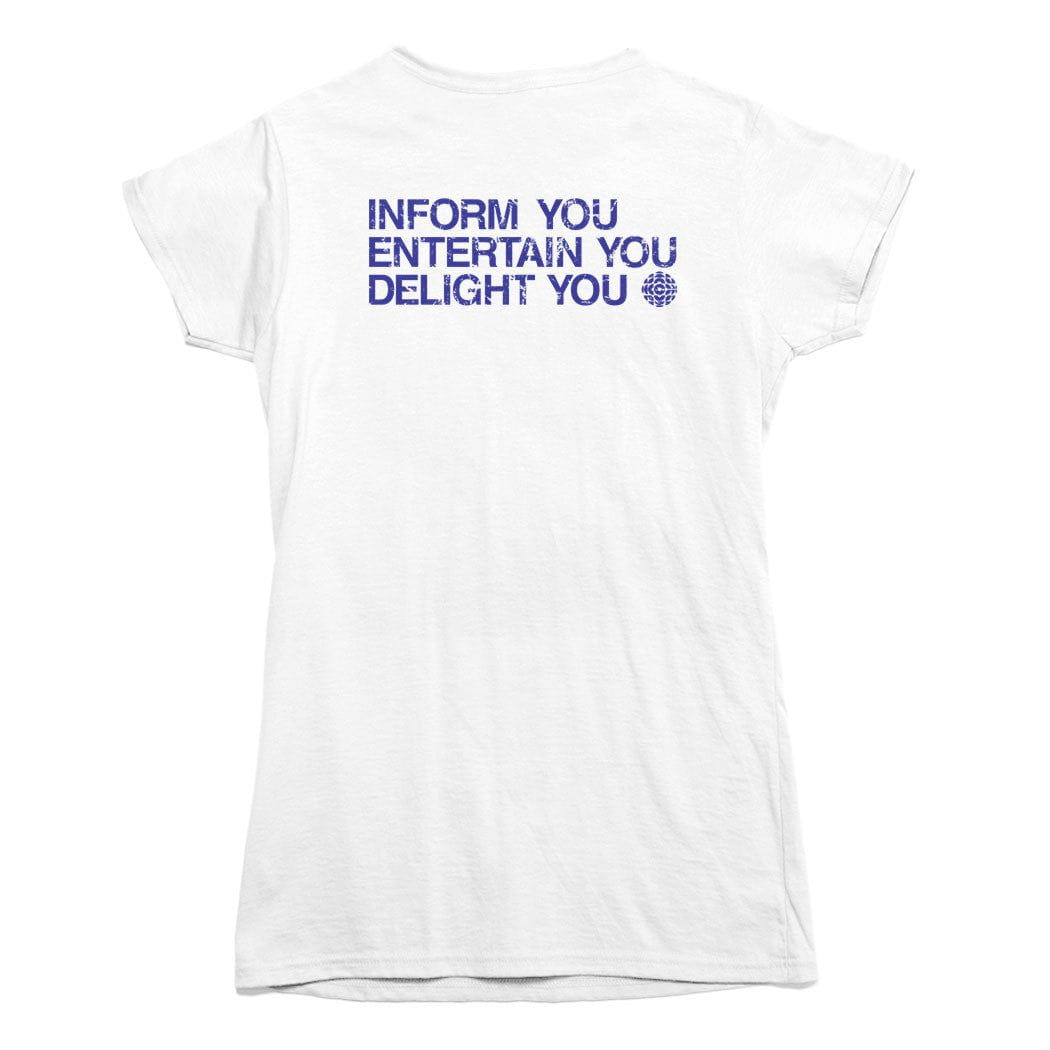 Flip it over, and the back delivers the perfect throwback slogan: "Inform You. Entertain You. Delight You." A nod to the mission of CBC Radio—keeping Canadians in the know, engaged, and inspired.