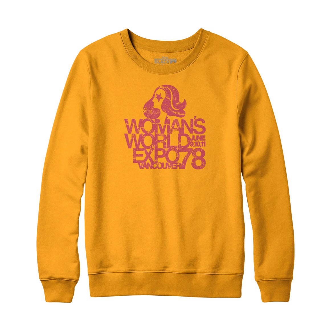 These comfy Fleece Sweatshirts celebrate the 1978 Vancouver Woman's World Expo, which was a pioneering event that celebrated and empowered women through a diverse range of workshops, seminars, and exhibitions, fostering a vibrant atmosphere of unity, education, and inspiration.