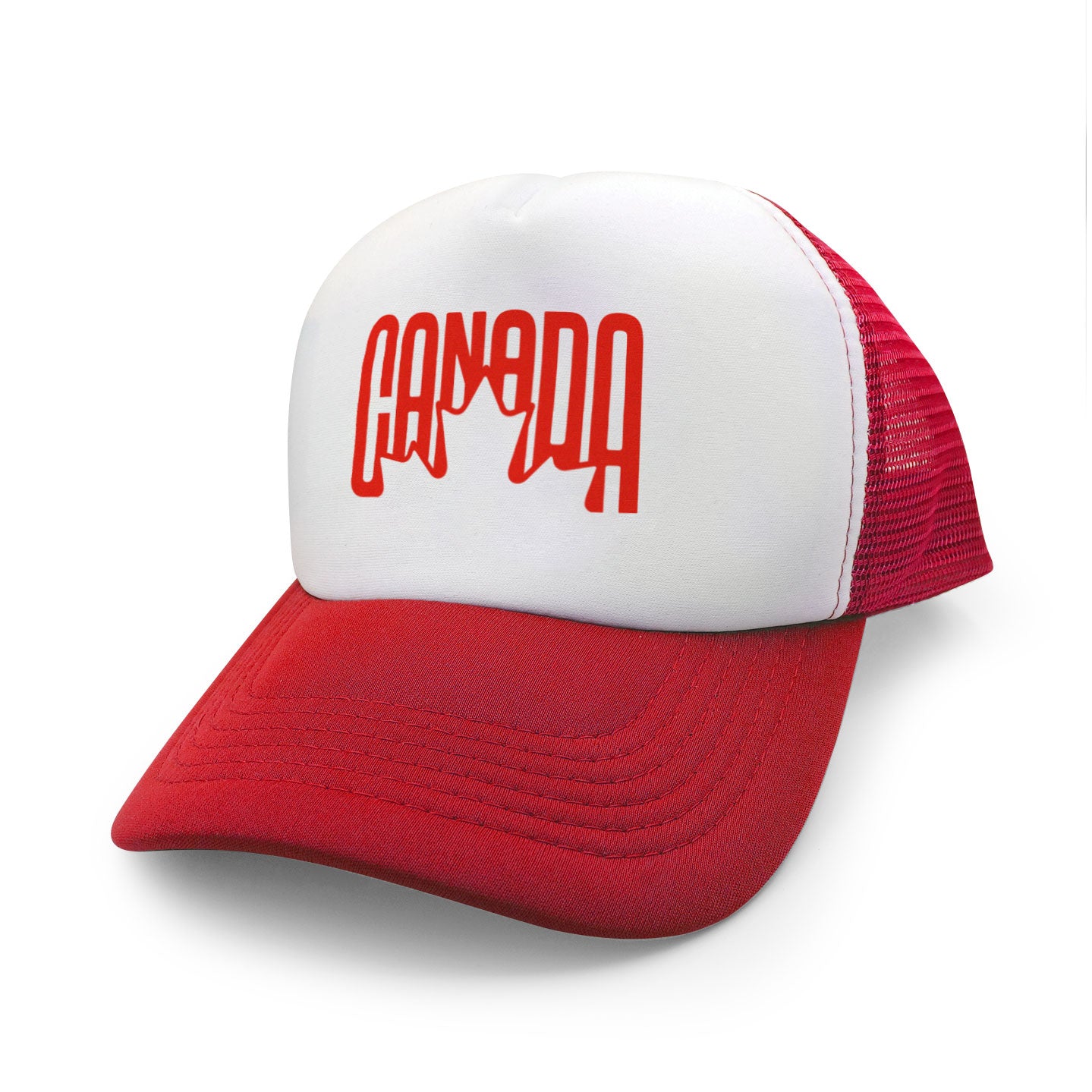 Canada Leaf Retro Design Foam Trucker Hat - Curved Brim Foam Trucker Cap / White with Red / Adjustable is backordered and will ship as soon as it is back in stock.