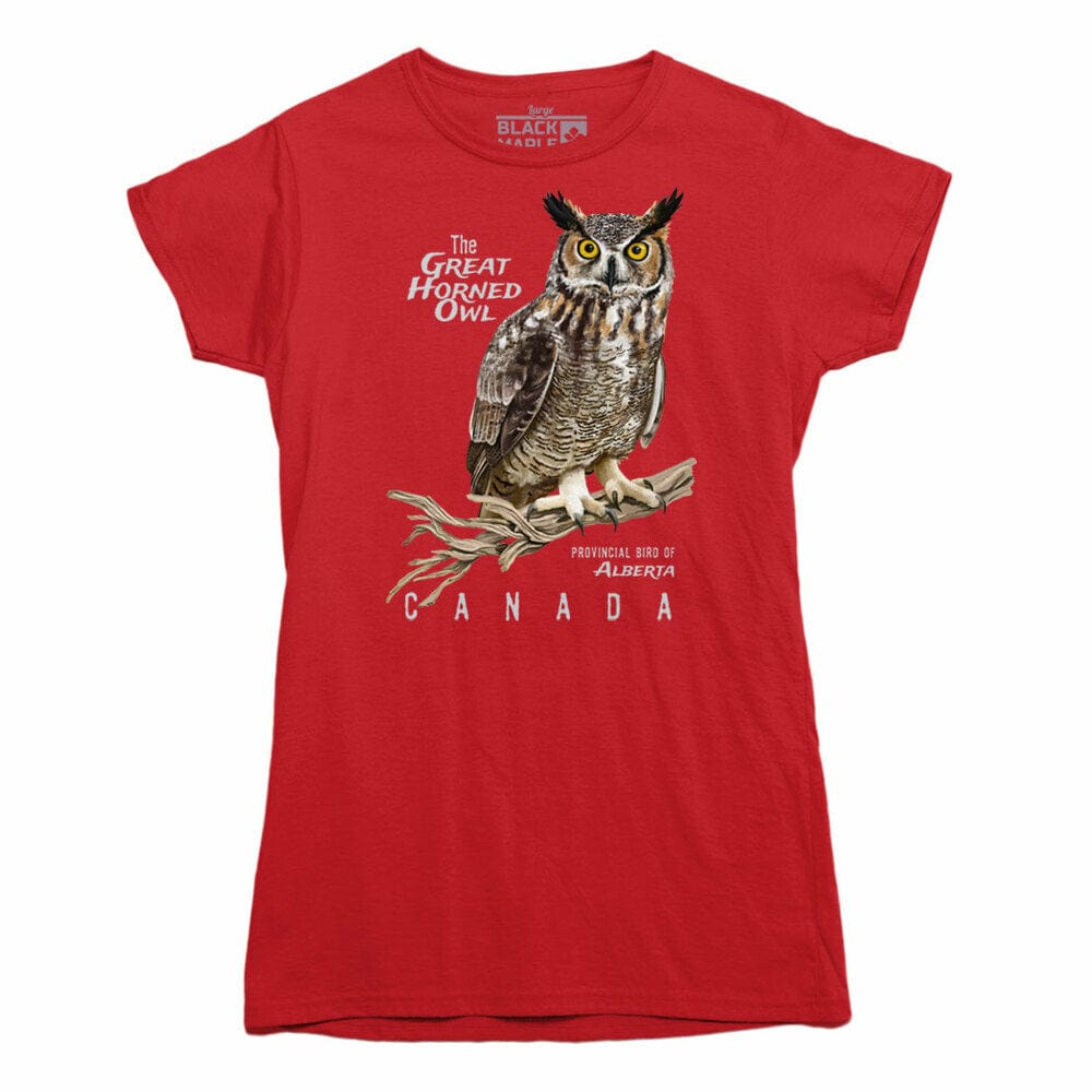 Alberta Great Horned Owl Provincial Bird T-shirt - Mens T-shirt / Red / S is backordered and will ship as soon as it is back in stock.
