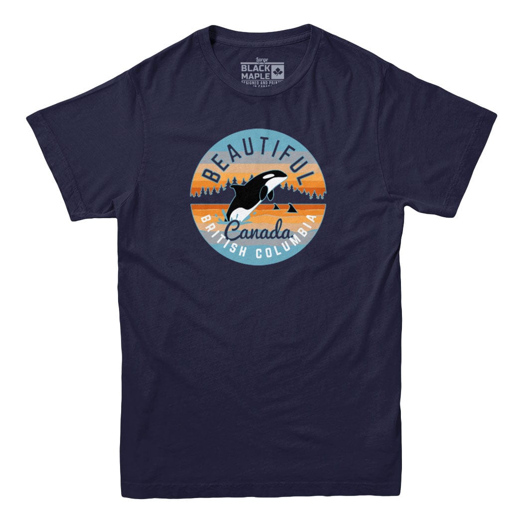 Beautiful British Columbia t-shirt depicting the iconic leaping Orca Killer Whale. This t-shirt is nearly as beautiful as BC itself- and will make your friends jealous.