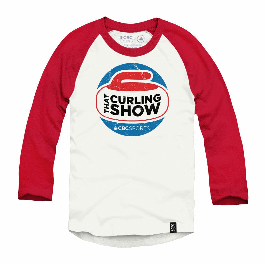 That Curling Show Rock Logo Baseball Shirt - Raglan / White with Red / S is backordered and will ship as soon as it is back in stock.