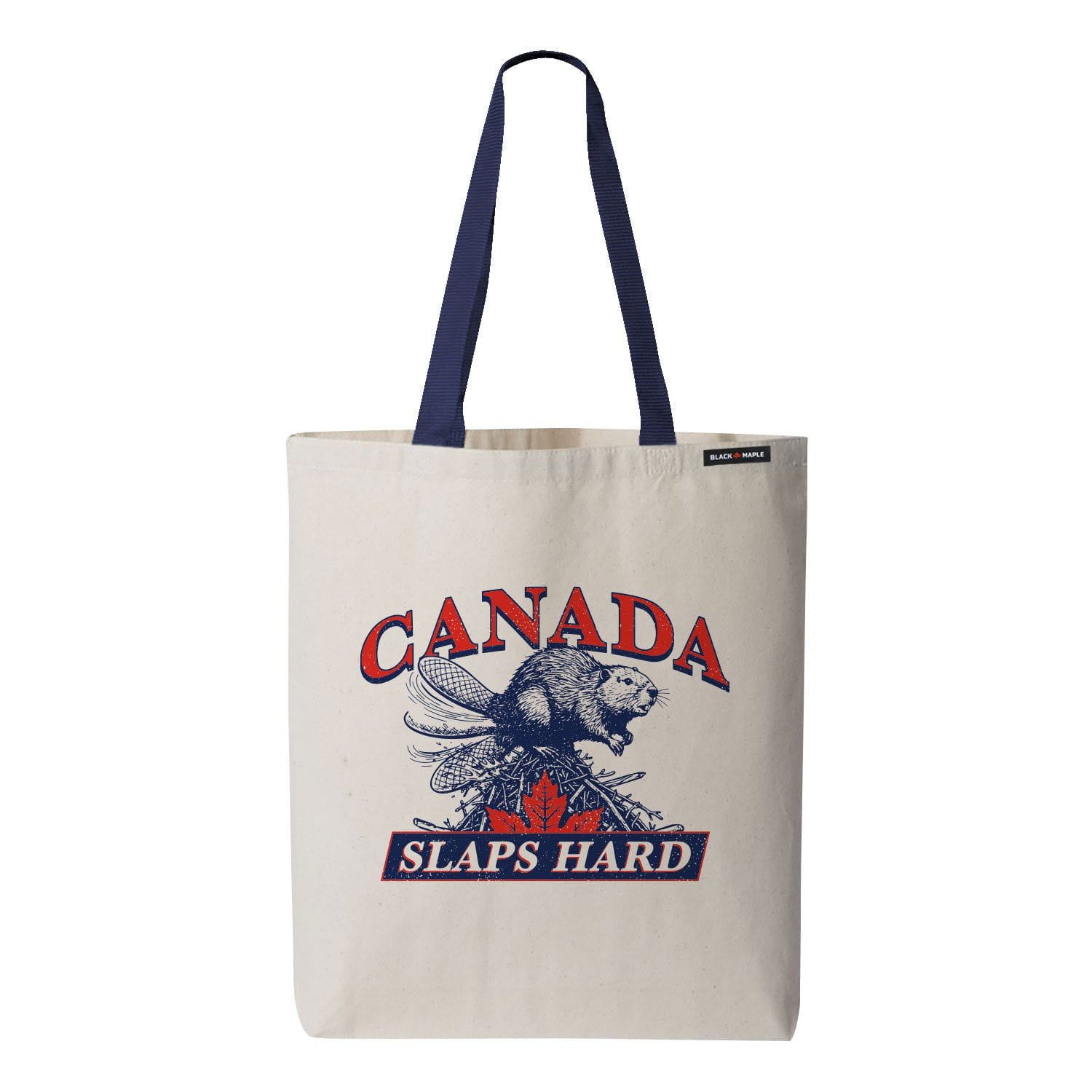 Carry your Canadian hockey pride with this durable cotton canvas tote featuring bold beaver artwork and "Canada Slaps Hard" messaging. The vintage-inspired design combines national spirit with hockey terminology that true fans appreciate.