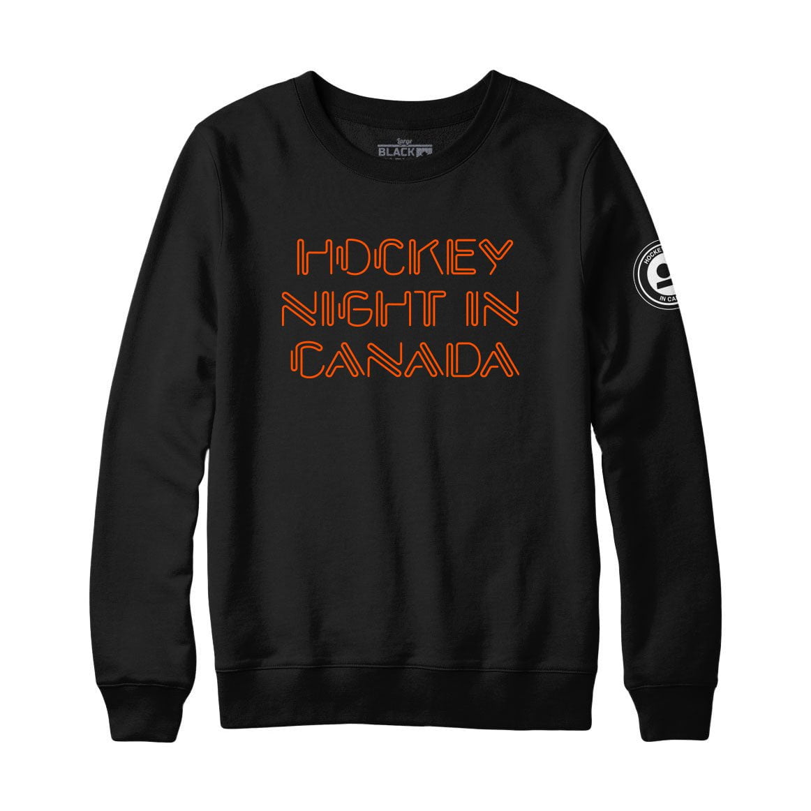 Canadians and hockey fans alike, rejoice – this Retro Hockey Night in Canada Neon Sign Sweatshirt or Hoodie is here! This unique, bold design celebrates decades of classic hockey coverage brought to us by Hockey Night In Canada, featuring a neon-style Hockey Night in Canada wordmark logo on the front and a Retro Hockey Night in Canada logo on the sleeve. Perfect for game days, lounging around the house or off-the-field activities, this sweatshirt/hoodie shows your Canadian pride and love for hockey. It's soft, comfy and warm making it your go-to option all season long. So don't wait for puck drop and grab yours now!