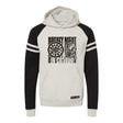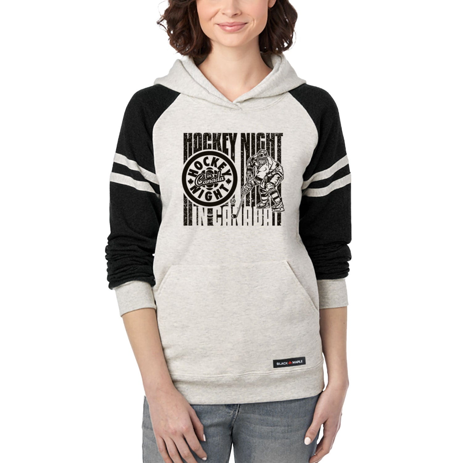 Score big with our HNIC Ice Hockey Player Varsity Hooded Sweatshirt. This dynamic design captures the energy of Saturday night hockey on our classic unisex hoodie. The vintage player silhouette stands out against the oatmeal heather body, while contrast raglan sleeves and varsity stripes complete the sporty look. Crafted from a comfortable 50/50 blend featuring sustainably-sourced USA cotton, it's perfect for hockey night any night.