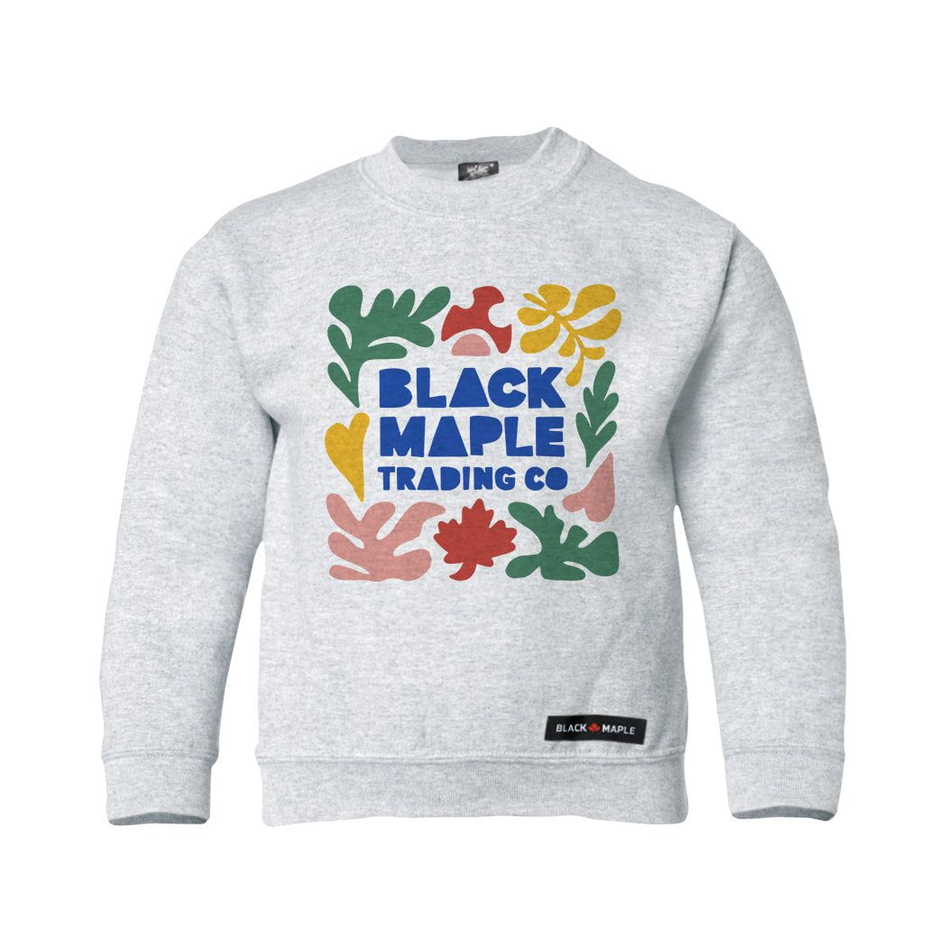 Let your little ones celebrate Canadian nature with this cozy kids' sweatshirt featuring our playful leaf design. Perfect for young adventurers, this comfortable piece showcases a vibrant botanical pattern surrounding a Black Maple Trading Co. logo.