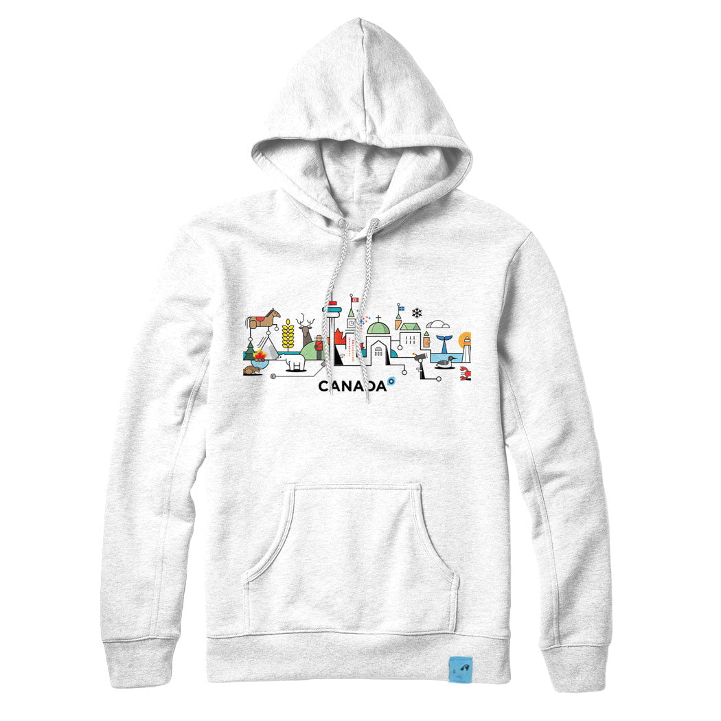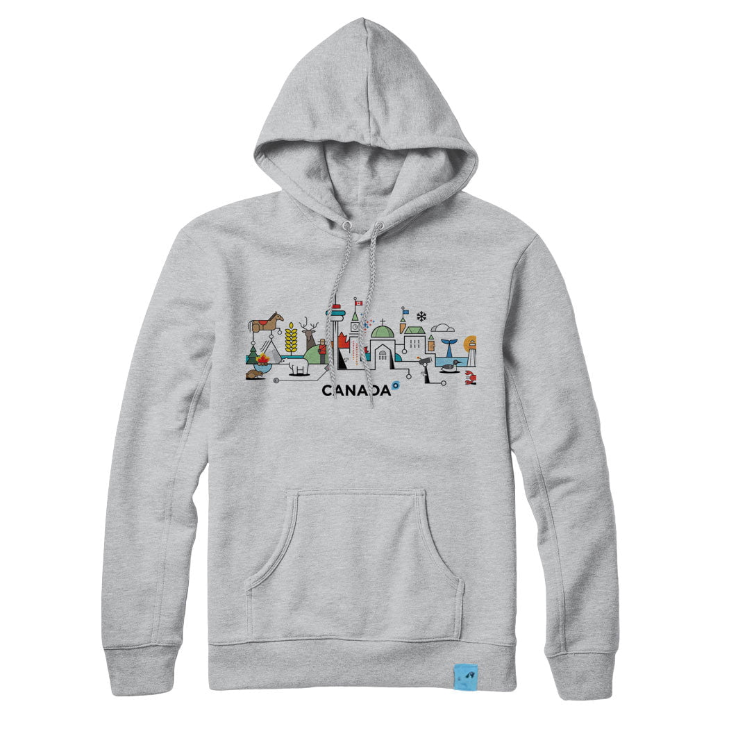 Celebrate your love for Canada and stay warm with this unique hoodie showcasing many of Canada's iconic imagery.