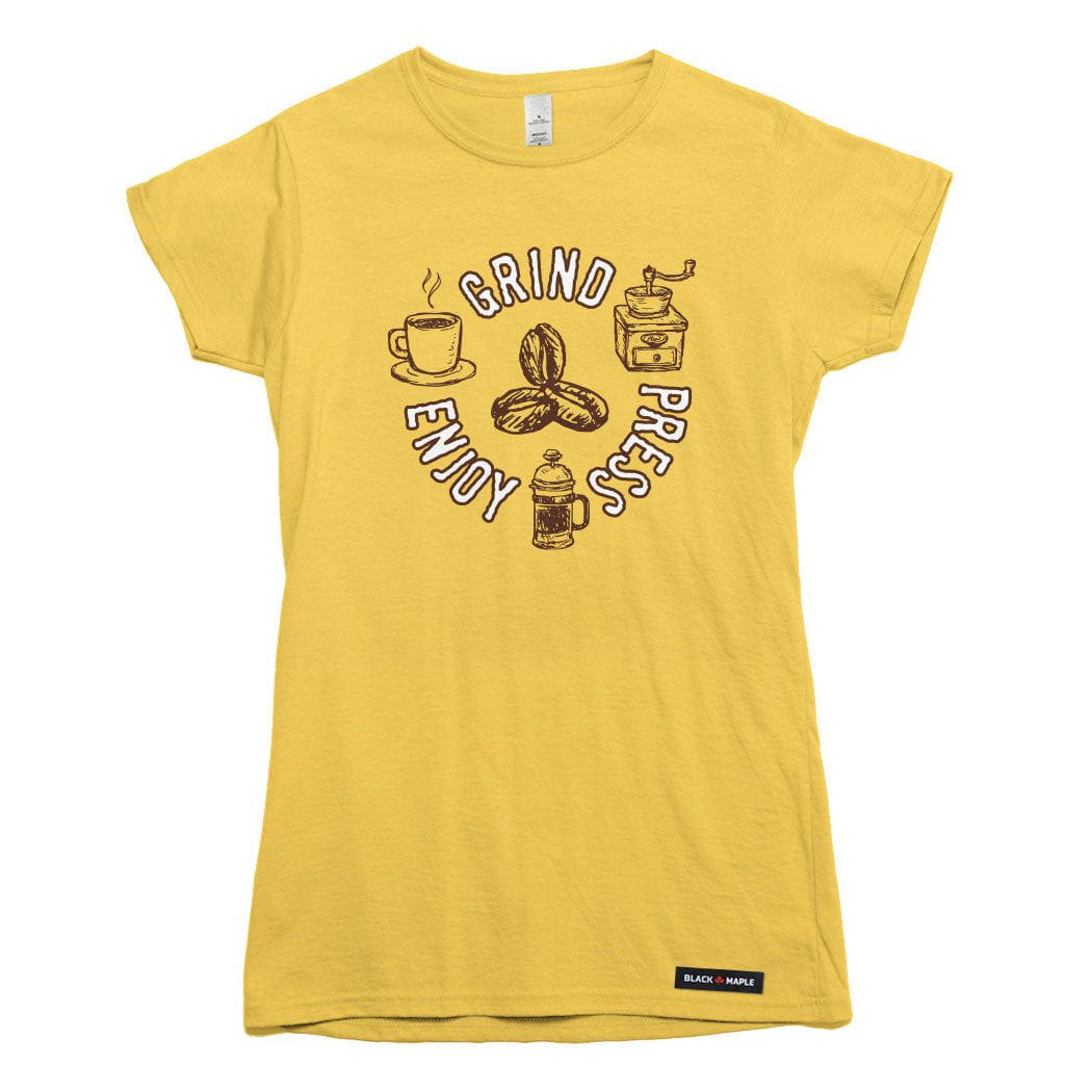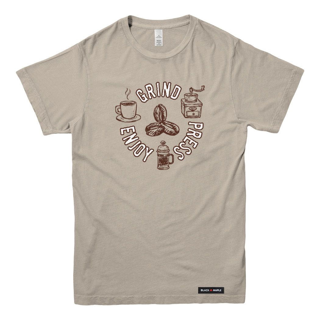 Coffee isn’t just a drink—it’s a process. Our Grind - Press - Enjoy T-shirt celebrates the coffee making ritual with simple, bold style.