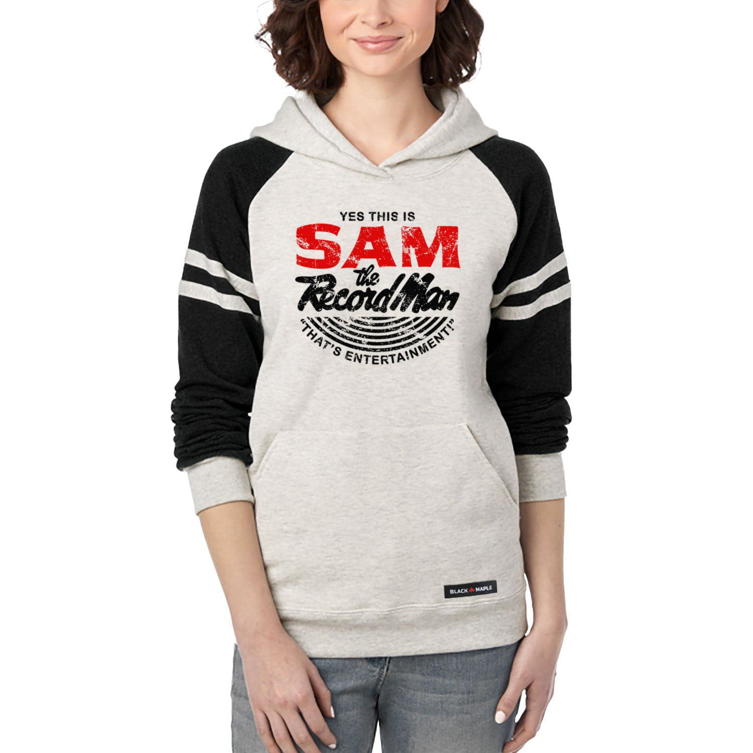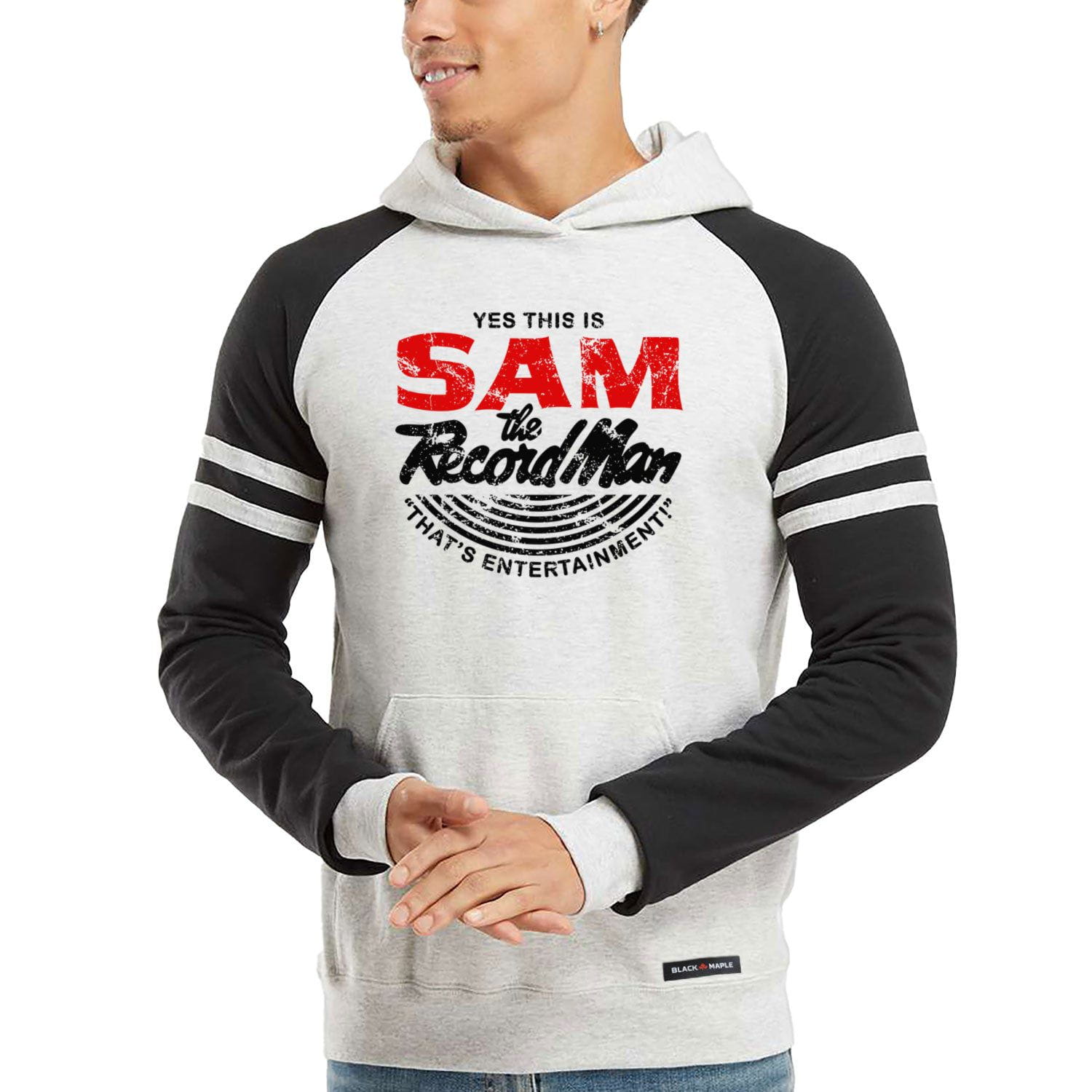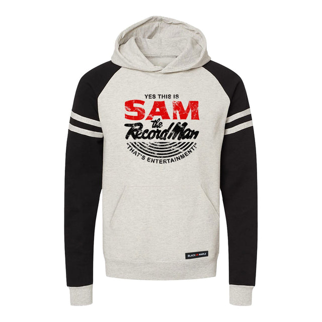 Spin into nostalgia with our Sam the Record Man Varsity Hooded Sweatshirt. The iconic logo from Canada's legendary music store illuminates our versatile unisex hoodie. The historic design shines against the oatmeal heather body, complemented by contrast raglan sleeves and varsity stripes. Crafted from a comfortable 50/50 blend featuring sustainably-sourced USA cotton.