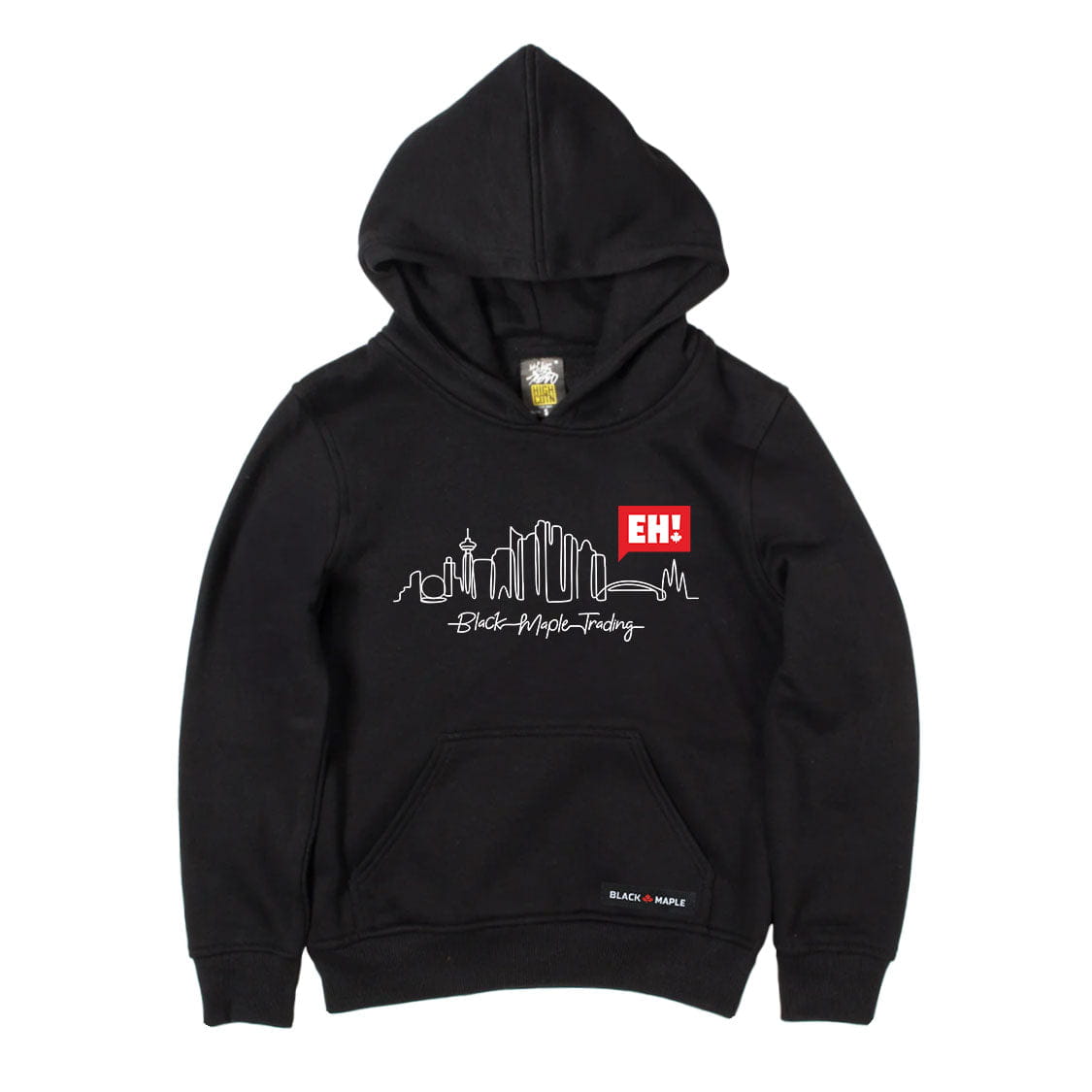 West coast energy meets everyday comfort in this kids sweatshirt or hoodie featuring the EH! Vancouver Skyline design.
