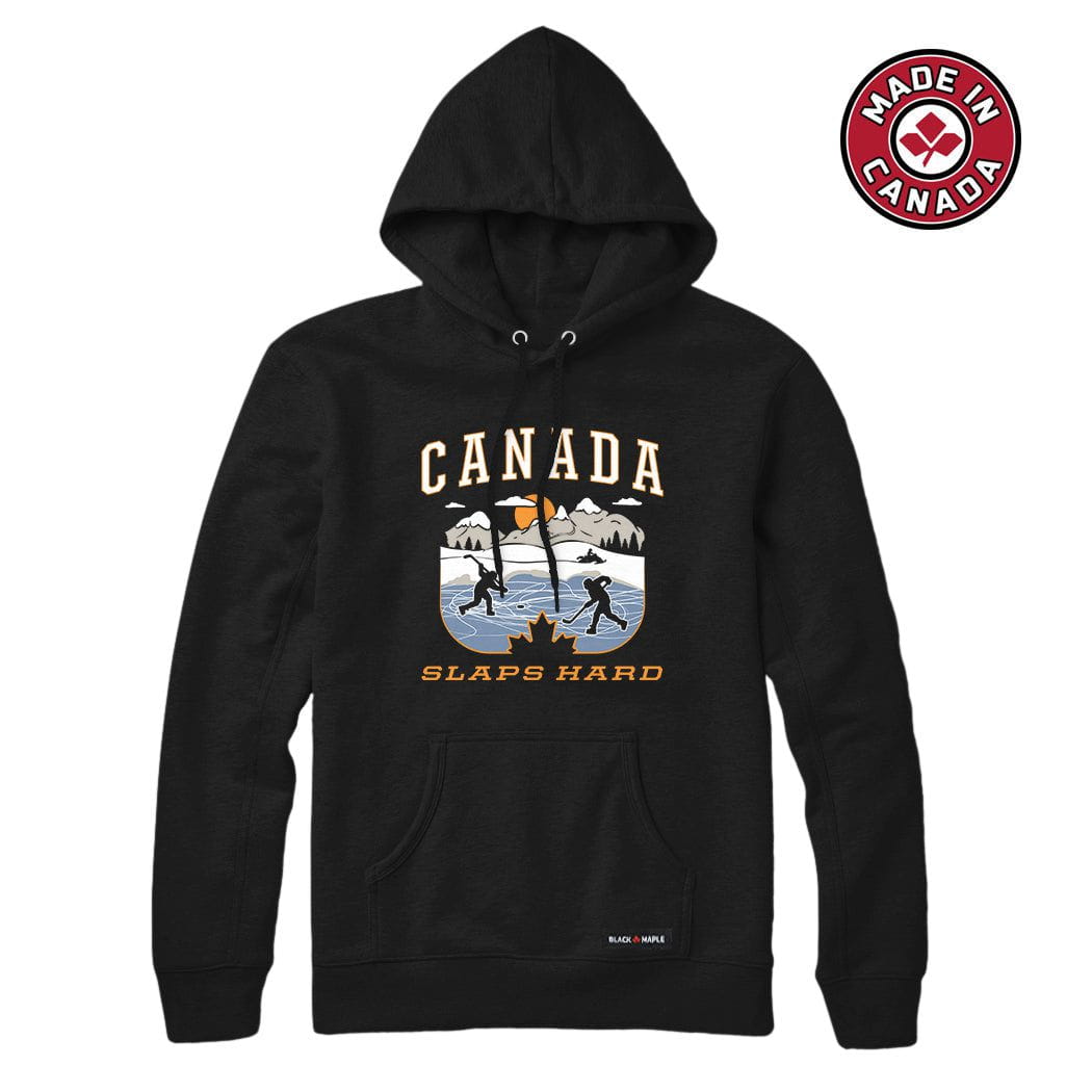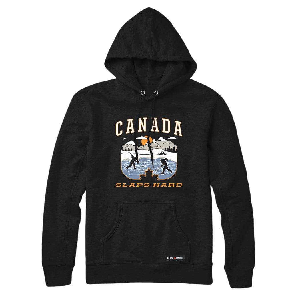 Celebrate the birthplace of hockey with this outdoor-inspired hoodie featuring the "Canada Slaps Hard" design. The graphic showcases players on a frozen pond surrounded by mountains and wilderness, capturing the essence of where hockey truly began - on natural ice under the Canadian sky.