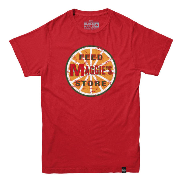 The Maggie's Feed Store Distressed Logo T-Shirt features the town of Hudson's iconic Feed Store logo. For years, Maggie's has been a hub where Heartland characters meet for a strong cup of coffee, and quality tack for their horses.